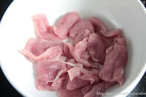 把买来的里脊肉清洗干净。先除去连在肉上的筋和膜。用刀背在肉上拍几下。切成2*3cm左右的薄片。放入碗中。