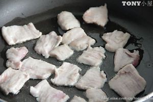 热锅后加入花生油,下腌制好的里脊肉片翻炒几下,颜色由红变白就拿出备用。