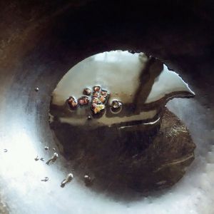 ~锅内放适量的油~用中小火炸花椒~待花椒炸透后~剔除花椒~用小碗盛出花椒油备用~