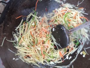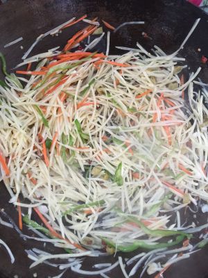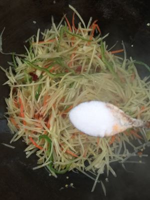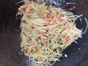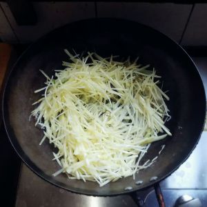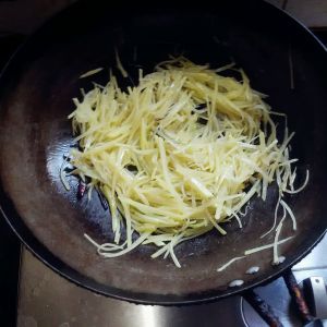 ~改大火~放入控干水后的土豆丝~翻炒至基本成熟~