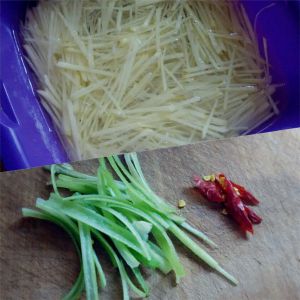 ~土豆切丝~用清水过几遍后~泡着备用~葱段切丝~辣椒切成小碎段~