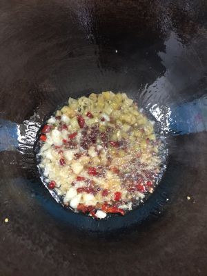 锅烧热倒入适量油,放入干辣椒、葱段、姜丝、蒜一起爆出香味