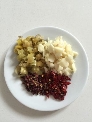 把葱,姜,蒜切成小段,干红椒,青椒切丝备用