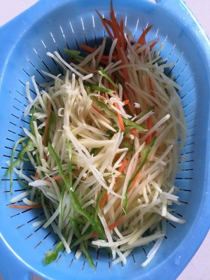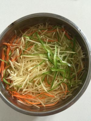 土豆削皮切成细丝,青椒切丝,胡萝卜切成丝放在水里浸泡5分钟,清洗几遍,去掉一些土豆里面的淀粉!