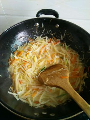 然后倒入滤过水分的土豆丝,炒到八分熟时加入精盐,味精调味,再加上香油和白醋,炒熟即可。