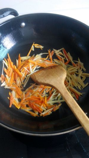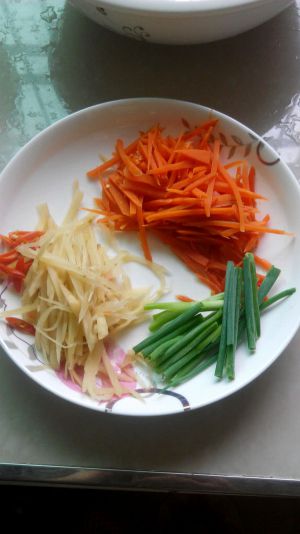 将胡萝卜,嫩姜和小辣椒切丝。葱长条。如图