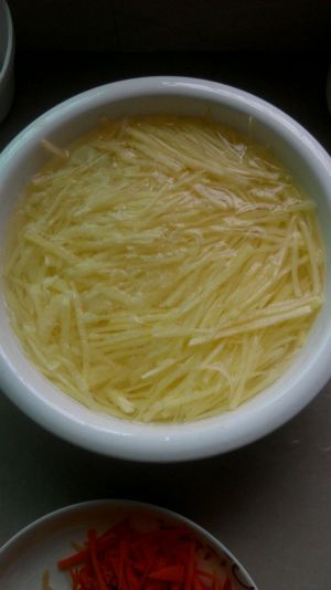 切土豆丝,清水泡一下,把淀粉洗掉。