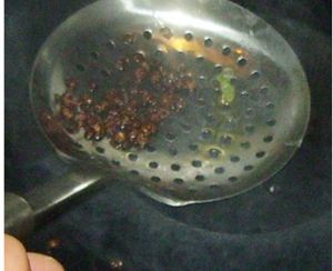 热油锅,油温热时把花椒放进去,炸出香味后把花椒捞出来不要