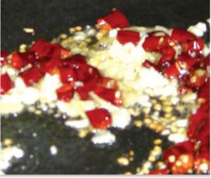 取 aca锅,锅中放油,油热后放入蒜片,和干红辣椒