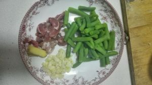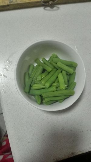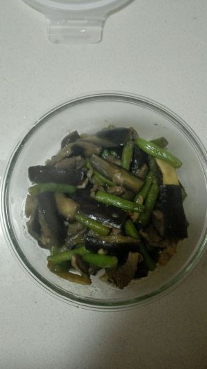 倒油,下姜末蒜,炒豇豆,炒两分钟倒酱油生抽,些微料酒,然后煸炒两分钟左右,倒入茄子,加少许水,盐,约十分钟,出锅。