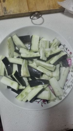 1.先把茄子切小段,切开没子的就是嫩的哦!(ps:我的茄子是不刨皮的,营养更好哦!)没用前先泡水里。