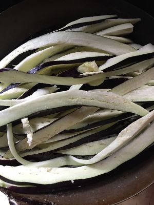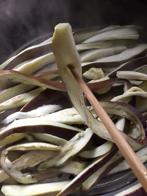 茄子上撒点盐。冷水锅蒸,大约15分钟,用筷子插透就可以了