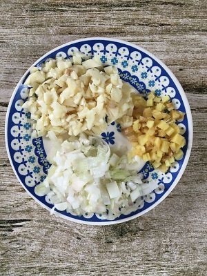 猪肉剁碎,放入料酒、盐、生抽、生粉腌制一会儿