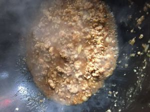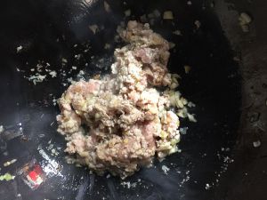 油锅烧热放入大蒜及腌制好的肉末翻炒一会儿
