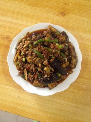 锅里热油放入葱姜蒜末炒香,放入肉末炒为变色,放入茄子炒蔫了加水过茄子面,水开放酱油耗油调色,尝一尝咸淡后放盐。盖好锅盖收汁时放入水淀粉勾芡出锅装盘!配上一碗白饭香香滴
