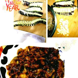 备料:1.喂肉馅:放葱末,姜末,酱油,耗油,水,顺时针搅拌! 2.茄子洗净,先横着切片不断刀(可以用筷子把茄子当着切就不会切断了)在反过来斜着切。就是图片效果了!嘻嘻很简单哦!我也是第一次切哈 3.葱姜蒜切碎备用