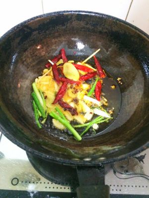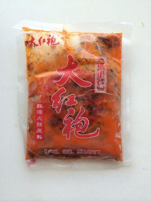倒花生油,比平时炒菜多一倍的量。爆香葱姜蒜,加火锅底料一小块,花椒辣椒,中小火炒化底料。