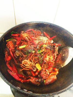 锅中放入油八成热后加入八角、三奈、花椒,然后放入豆瓣酱煸炒,(我家比较喜欢吃辣,我还加入了泡椒,小米辣)再依次加入姜末,蒜头,炒香后放入小龙虾,水分煸干后加入料酒翻炒后,加水(以淹过小龙虾为宜),大约煮20分钟左右收汁加入葱段,装盘即可!