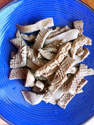 将猪腰子洗净 打上十字花刀 然后切成段 放在水里把血水浸泡出来