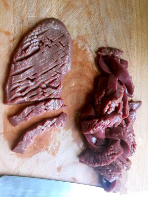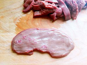 猪腰子用快刀从中间片开,去除内里,如果你想要舒展的腰花,就从外面打花刀,如果想要弯弯的腰花就从内里打花刀,我今天切的是舒展的腰花