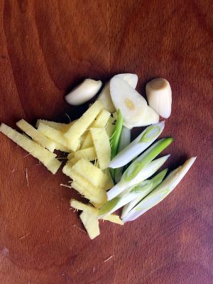 铁锅烧热,花生油烧热,加葱姜蒜及酱油爆香,酱油多放一些,炒出酱香