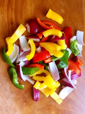 浸泡期间将青红黄彩椒及圆葱洗净切长方形小块儿
