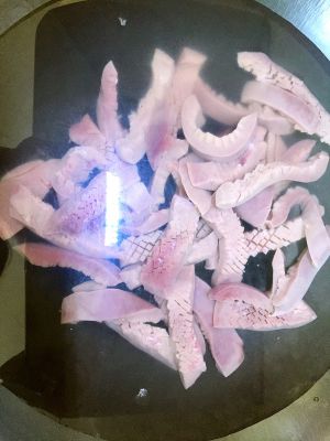 然后 放入比平时炒菜多三倍的油 烧入6成热是下焯过水的猪腰子 它的刺都会起来了 (开心)