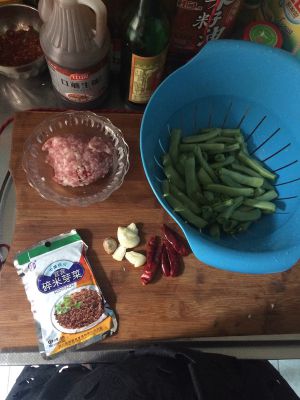 四季豆去筋丝择段洗净,芽菜干货店或者超市里都有卖,材料都备好切好,蒜姜切末,干辣椒斜切丝。