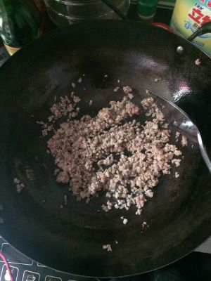 满满的中火炒,一直到五花肉末吐油发黄撒盐和生抽调味