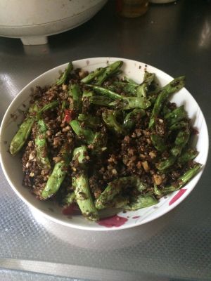 炸好后的四季豆呈出来就是这样子的,锅里的油留一点炒肉末,剩下的油用碗装起来可以用来炒菜。