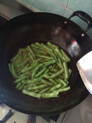 待油烧至十成熟 放入整理成小段的四季豆 大火爆炒