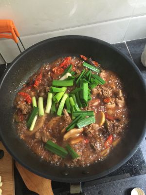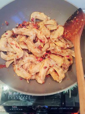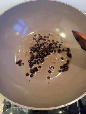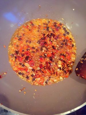 豆鼓炒出香味后放大蒜生姜小红辣椒末,在放入适量豆瓣酱