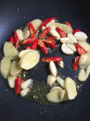 先把蒜仁,小米椒,姜炒一下