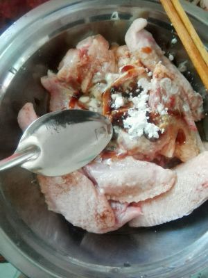 我这个是一整个翅 把它分成三截了,在翅切两刀入味点 。把一勺耗油 (是一勺哦) 酱油那些料放进去 还有三勺可乐。腌一小时 中间翻另一面腌 我用的是这么大的勺子