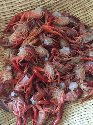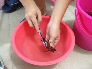 龙虾用牙刷把腹部头部刷一刷,再淘洗几遍,要小心,老公手都被夹流血了