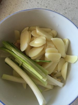 2.准备的配料有大蒜子、花椒粒、小米椒、生姜、小葱;小葱切葱花,生姜切片,小米椒切末,葱白也切末,大蒜子剁成末备用;