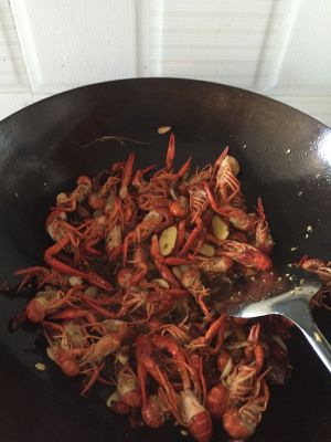 油烧热,油要多哦先下入葱姜蒜,再下辣椒和八果等香料,炒香后加入龙虾爆炒!