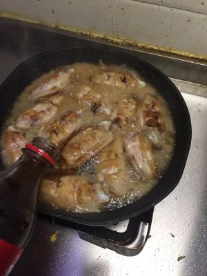 表面微微金黄的时候,鸡翅的油也出来一些,若喜欢少油的可倒出一些,然后把可乐加进去,量以没过鸡翅为准,然后是酱油~酱油的比例应该是可乐的一半,也就是说,600ml可乐配300ml酱油,最早我用过老抽,味道我喜欢,但是颜色黑黢黢的卖相不好,如果全是生抽的话,做出来基本上是金黄色的,也可以两种掺着,我现在佛系做法,加多加少我也不知道,看着差不多了就行了