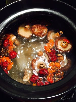 放入事先泡好的香菇若干~然后盖锅盖,煮一小时左右~