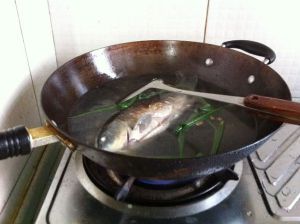 准备一壶开水备用,米饭蒸上,淘米的水留着洗鱼,起到去腥的作用。 鱼洗净后将葱塞进鱼肚里,也是起到去腥的作用 。