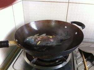 热锅下油,至油温80度左右,放入生姜炒下,加点盐,以免油溅起来,放入鲫鱼两面煎黄