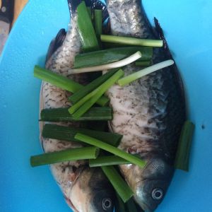 鲫鱼腌制 抹盐 摆上葱姜 倒上料酒