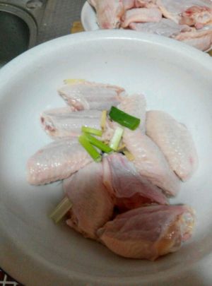 先准备主料。切好生姜,八角。放到碗里准备。洗干净鸡中翅后。下凉水锅里。将鸡翅、生姜八角、白酒一同倒入锅中,待水开后,捞起鸡翅备用(作用:去腥。初步入味)