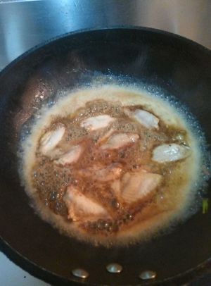 如果是不粘锅,可以不放油,我家是不锈钢锅,所以放了部分油,把鸡翅有毛孔的一面先煎,煎到微微发黄