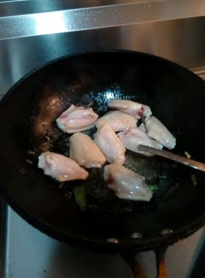 热锅放油。初次做这道菜的朋友记得一定要开小火烧油,放一点盐,这样不容易在鸡翅下锅的时候被油溅到,鸡翅也不会因为油温过高而面目全非。煎的整个过程都是小火慢煎,直至鸡翅两面金黄。关火,捞起。将锅内的油倒入另外一个碗里。然后开火放鸡翅、八角、生姜。可乐。小火慢炖。