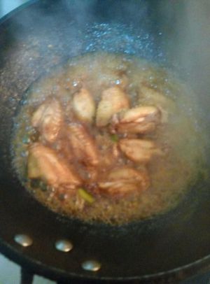 要时不时看看锅里面的可乐汽水有没有全部烧掉,以免走神或者神游导致鸡翅糊掉。可乐鸡翅不需要加酱油上色,因为可乐本身就有焦糖。是可以上色的