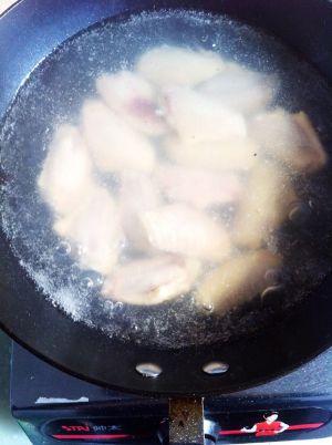 另起一锅,鸡翅放入油锅煎5分钟,注意要小火煎,煎至鸡翅表面微黄