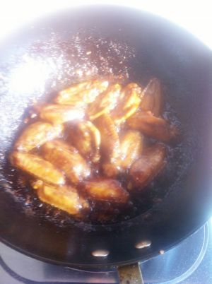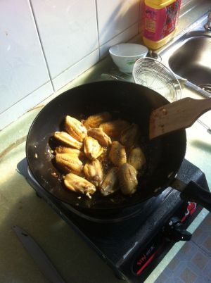 起锅放油 蒜末 然后放入鸡翅 放入葱 姜 八角 煎至两面金黄 记得随时翻动哈 以免粘锅 煎到这种程度的时候加一些料酒 白糖一点点 生抽 (最好是老抽 上色比较好)然后加入可乐 盖过鸡翅就好 然后就等收汁啦 汁收好基本就熟了 不放心的话用筷子捅一下 很好捅就OK了