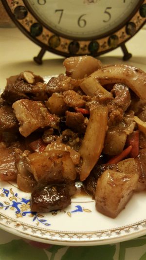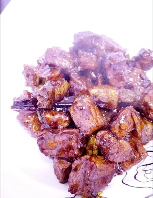 锅内放油 加糖 小火 等糖慢慢融化放肉 使每块肉都沾糖炒两三分钟