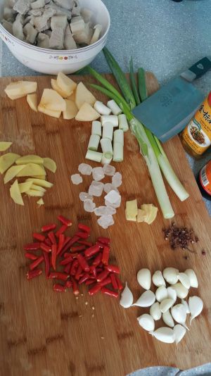 炒锅放油,爆香花椒姜片葱白,再放入蒜和米椒,炒出辣味,再放入肉片,需不停翻炒,以防粘锅。再放入料酒和酱油。炒过后,倒入汤锅,汤锅里倒入肉汤和水,放入蒜苹果冰糖,水开后,转小火,炖40分钟。也可熄火盖上汤锅盖,多焖一会。